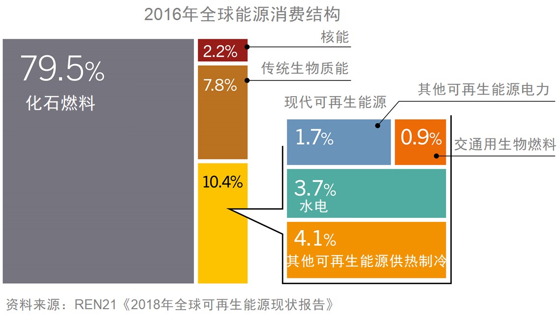 根据REN21发布的《2018年全球可再生能源现状报告》显示,化石燃料仍是全球的主要燃料。2016年,全球能源消费结构中79.5%为化石燃料、18.2%为可再生能源、2.2%为核能。