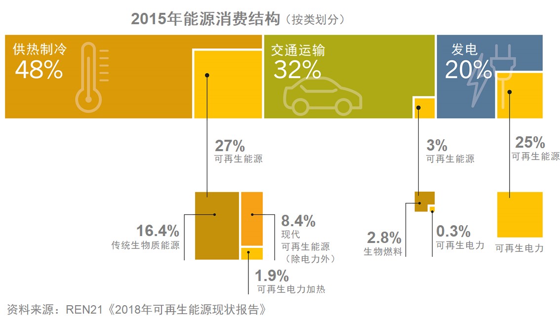 但是,“电力”不等同于“能源”,在能耗占据全球能源消耗比例将近一半的供热、制冷领域,对可再生能源的使用以及能源利用技术发展远远落后于电力行业,严重依赖化石能源以及传统的单一能源系统。