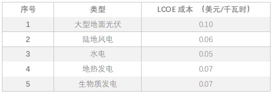 在2017年在20国集团(G20)范围内的化石能源发电LCOE成本范围在0.05-0.17美元/千瓦时,而相比之下,到2020年,所有商业形式的绿色能源发电成本范围在0.03-0.10美元/千瓦时。所有可再生能源发电成本将远低于传统化石燃料。