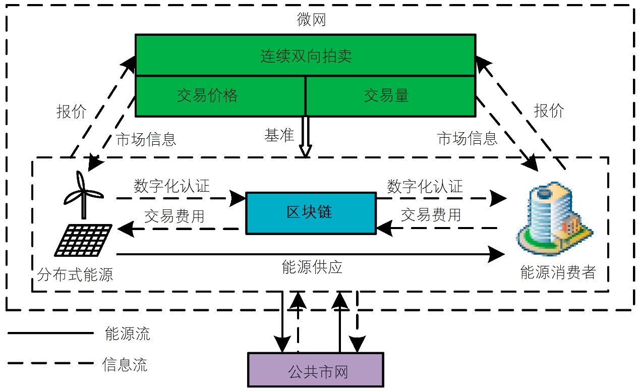 在互联网技术、清洁能源迅猛发展的趋势下,各能源终端设备加速链接构建智能微网。而区块链数字化信息账本的去中心化特性使得交易很安全,使设备间可以互相可靠的通讯,应用程序给用户控制交易的权利,所以区块链技术作为最有效的通信协议,让网内每个设备、每个用户都可以自由接入,通过多设备平台应用程序进行实时操作,实现能源的数字化精确管理,实现能源供应端的波动性与需求端的灵活性交易及调节。