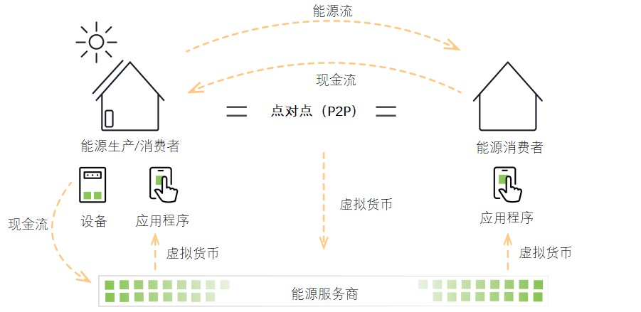 使用区块链进行点对点能源交易,通过用加密虚拟货币代替传统交易服务,使能源买卖更快速,实现一种“交互的能源”。