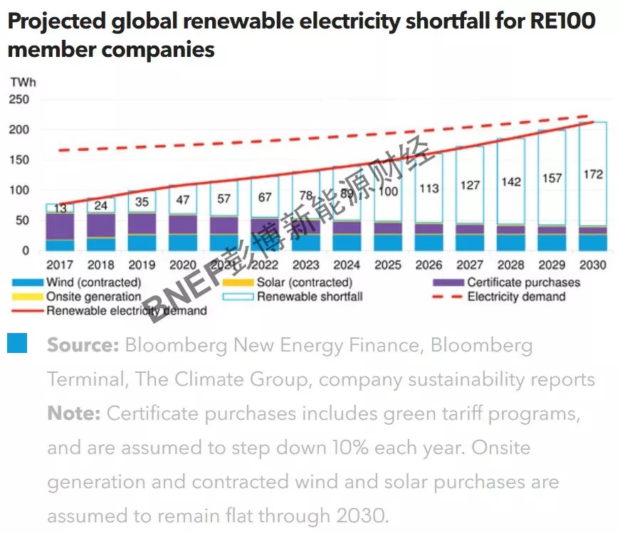 根据BNEF(彭博新能源财经)发布的相关报告显示,预计到2030年RE100公司的总用电量将增长至223TWh。为了实现清洁能源的目标,可再生能源电力缺口将达到172TWh,相当于埃及和美国伊利诺伊州2016年全年的总用电量。